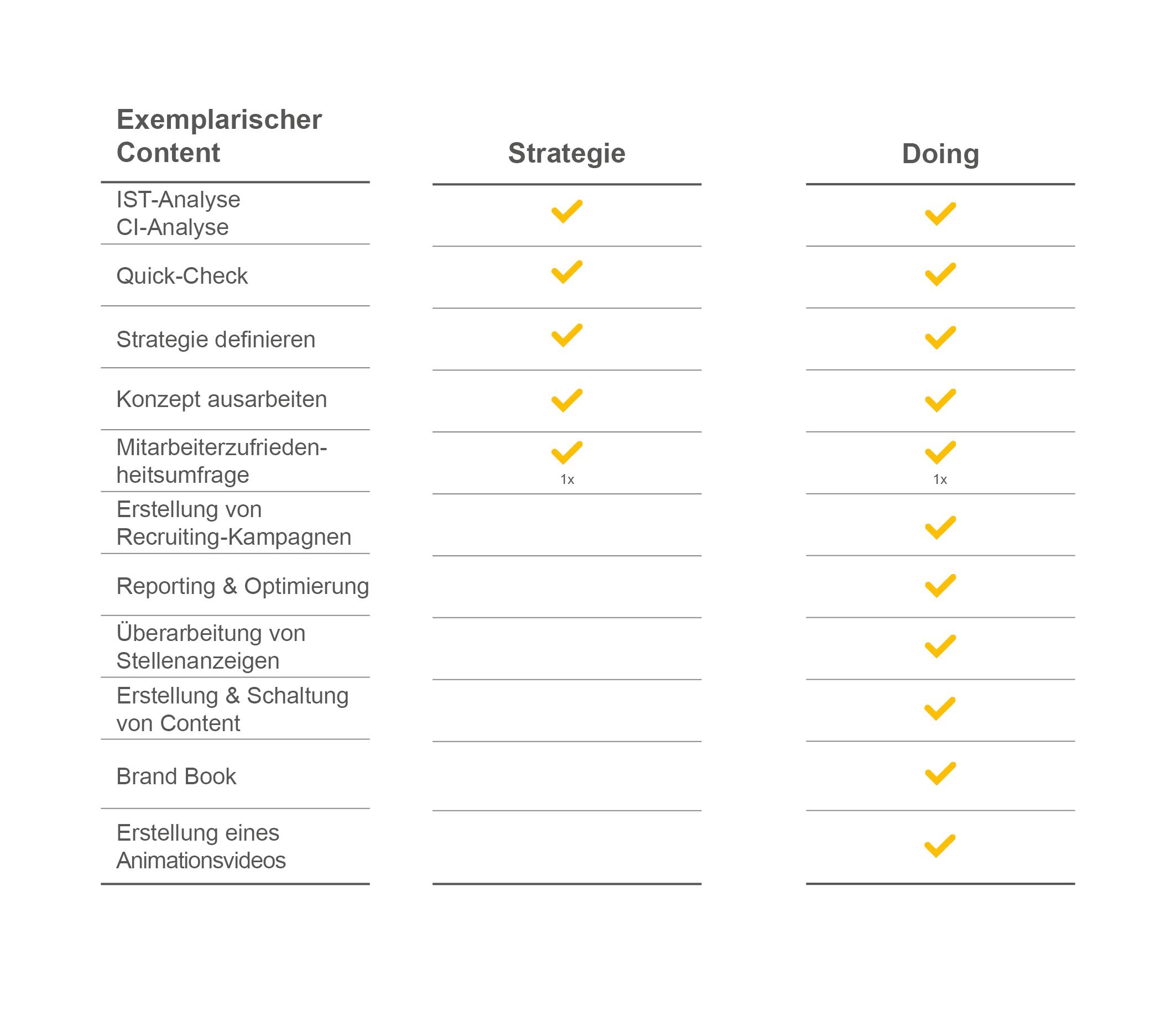 Mit dem Paket Doing erhalten Sie ein Rundum-sorglos-Paket. Wir betreuen Ihren Online-Auftritt, entwickeln und setzen Recruiting-Werbekampagnen um und unterstützen Ihre gesamte interne Kommunikation. So können Sie sich auf das Wesentliche konzentrieren.